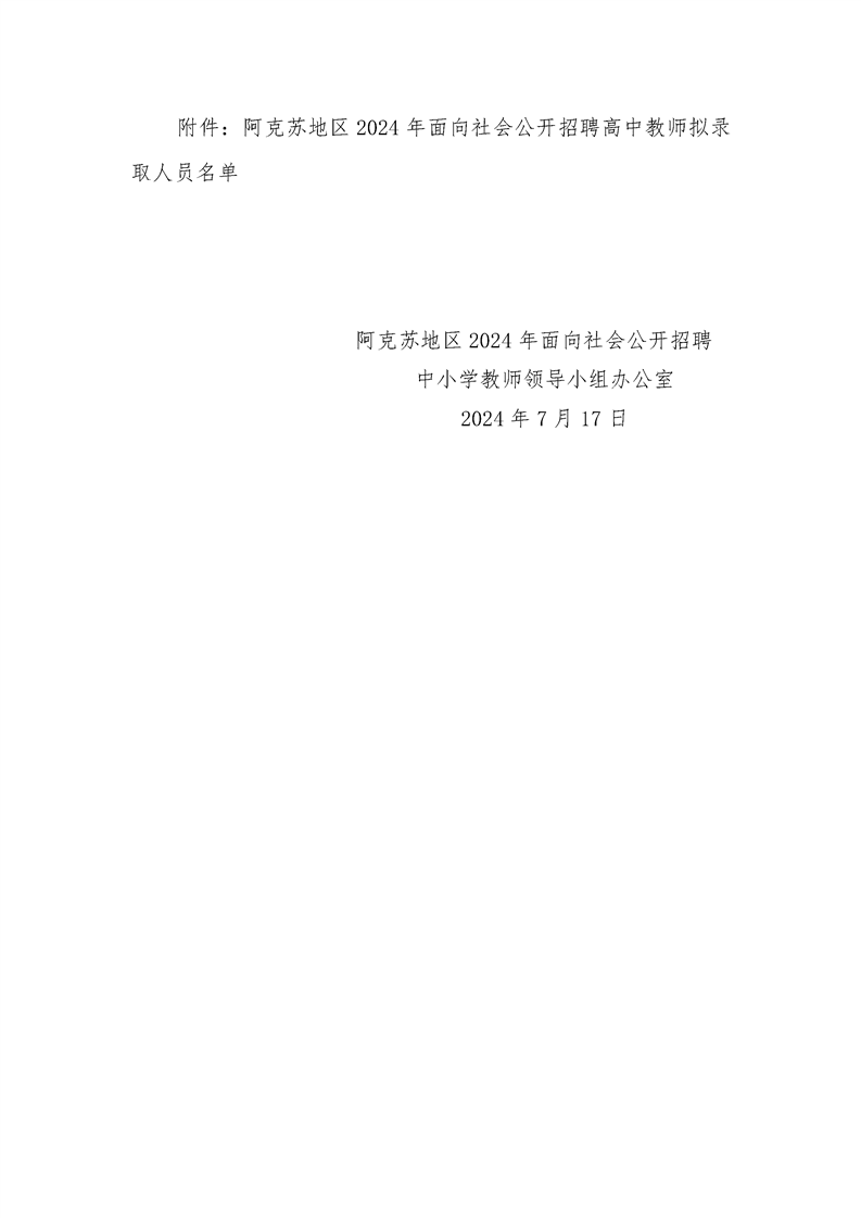 阿克苏地区2024年面向社会公开招聘高中教师拟录取人员公示