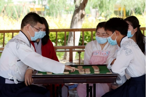 游客成鹏翔作为象棋爱好者,看到景区有象棋展示,便与身穿汉服的工作人员对弈一局。“天气热,过来玩水避暑,风景又美,娱乐项目也多,这里还能免费品茶下棋,感觉太好了。”成鹏翔说道。