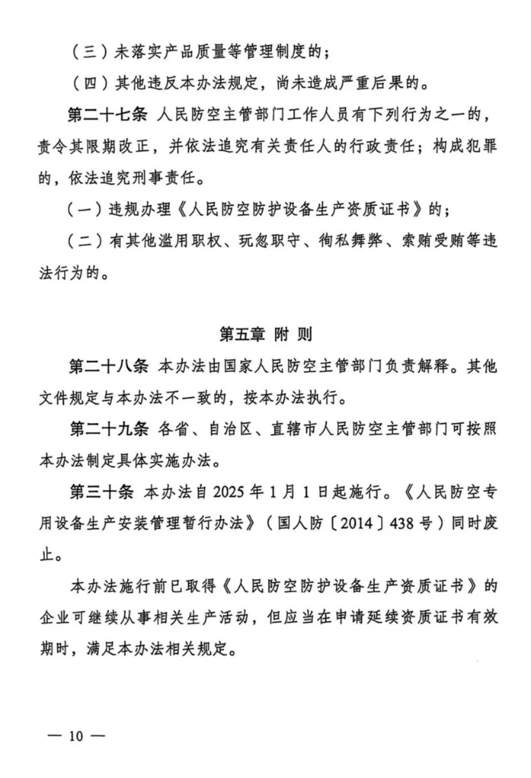 近日,国家发展和改革委员会公布第24号令《人民防空防护设备管理办法》,共五章三十条,自2025年1月1日起施行。这一管理办法的出台对于规范人民防空防护设备行业管理,加强人民防空建设具有极其重要的意义。原文如下↓