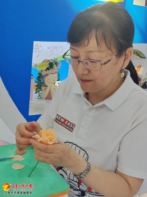 “翻糖类作品,不仅艺术性很高,也有很强的实用性,经常用在各种纪念日、大型活动现场以及婚礼现场,不只美观,也可以食用。”乌鲁木齐新东方技工学校西点专业老师吴红艳,是以她的名义命名的糖艺西点技能大师工作室负责人,现场展示着自己的技艺。她说,不只是花朵,用翻糖可以塑造各式各样的造型,可以融入各种元素,教学过程中,不仅传递技艺也传递文化。