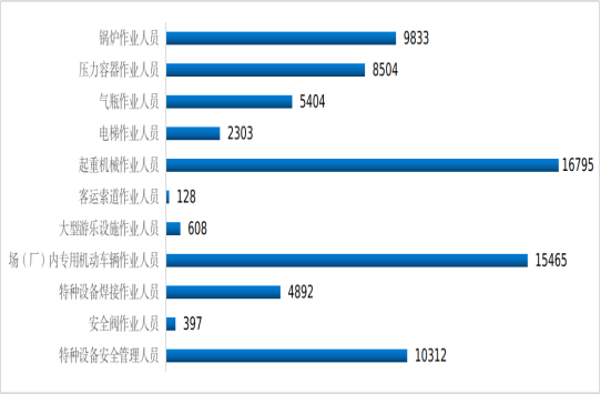 截至2024年12月15日,全区共计有各类特种设备作业人员25.5万张。2024年共计核发作业人员证7.5万张,其中锅炉作业9833张、压力容器作业8504张、气瓶作业5404张、电梯作业2303张、起重机械作业16795张、客运索道作业128张、大型游乐设施作业608张、场(厂)内专用机动车辆作业15465张、特种设备焊接作业4892张、安全阀作业397张、特种设备安全管理人员10312张。全区2024年核发特种设备作业人员证情况见图6。