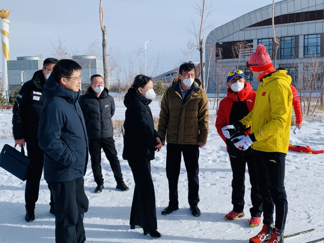 随后,古丽局长一行来到训练场地慰问了在中心训练的越野滑雪、速度滑冰、短道速滑等项目运动员。古丽局长与教练员、运动员进行了亲切交流,询问了他们训练、学习和生活情况,实地查看了运动队训练场地情况,并听取了冬季运动管理中心主任康永新对各项目运动队伍训练及备战情况的详细介绍。