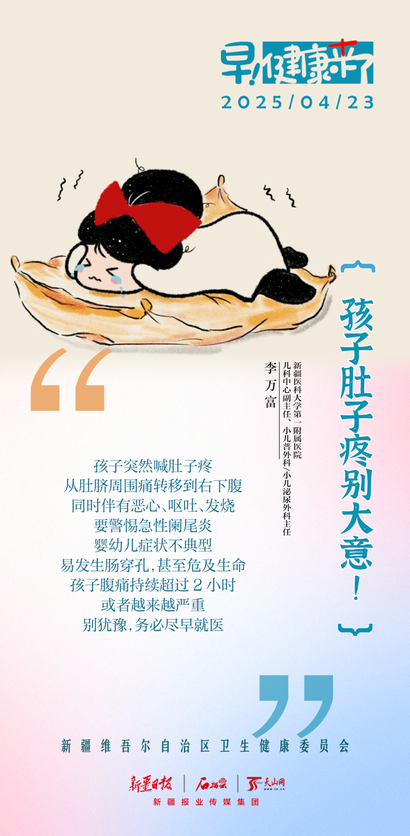 新疆医科大学第一附属医院儿科中心副主任、小儿普外科/小儿泌尿外科主任李万富提醒:
