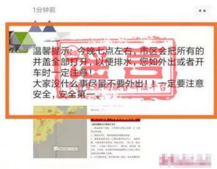 2019年,台风“利奇马”登陆我国,后期随着“利奇马”强度渐弱,谣言的关注点从台风危害转向了生产生活。2019年8月13日,网传消息称“XX市地面井盖全部打开以便排水”,蓬莱、潍坊、沈阳、东营、滨州等地躺枪,相关部门及时辟谣称,从未发布过此类消息,只是把低洼处下水道井盖和地漏打开,并设好警示信息。