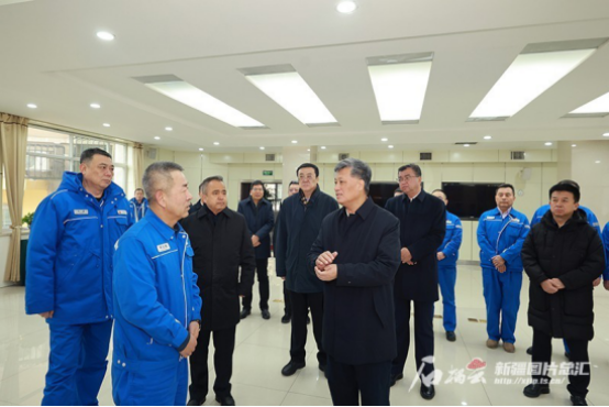 2月12日,自治区党委书记马兴瑞、自治区主席艾尔肯·吐尼亚孜在乌鲁木齐石化公司,听取有关工作介绍,了解企业生产经营、减排降碳、技术攻关等各项工作开展情况。石榴云/新疆日报记者崔志坚摄