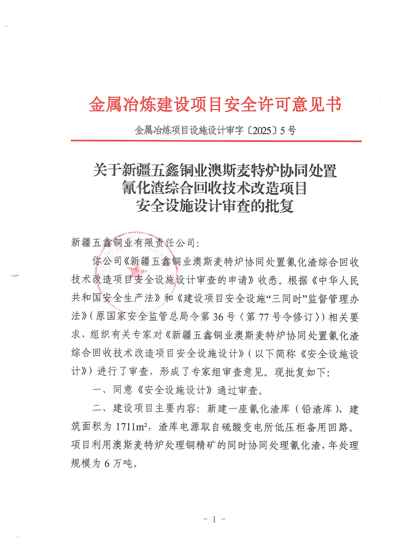 关于新疆五鑫铜业澳斯麦特炉协同处置氰化渣综合回收技术改造项目安全设施设计审查的批复